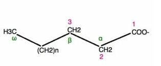 脂肪酸由碳鏈組成,碳鏈的一端為甲基,而另一端為羧基。甲基被稱為ω,位于羧基旁邊的碳原子被稱為“α”碳,其次是“β”碳,等等。脂肪酸分子還具有兩個(gè)化學(xué)上不同的區(qū)域: