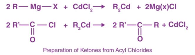 酰氯在用格氏試劑和金屬鹵化物處理后產(chǎn)生酮。例如:氯化鎘與格氏試劑反應(yīng)時,生成二烷基鎘。由此形成的二烷基鎘進(jìn)一步與酰氯反應(yīng)形成酮。