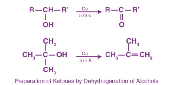 酮的脫氫是在氧化時從醇分子中除去兩個氫分子的反應(yīng)。在醇的氧化過程中,CO和OH鍵均斷裂以形成C=O鍵。仲醇在強(qiáng)氧化劑存在下脫氫生成酮。例如:當(dāng)仲醇的蒸氣通過 573 K 的加熱銅時,由于脫氫而產(chǎn)生酮。氧化后的叔醇進(jìn)行脫水而不是脫氫。因此,在叔醇的情況下制造烯烴。