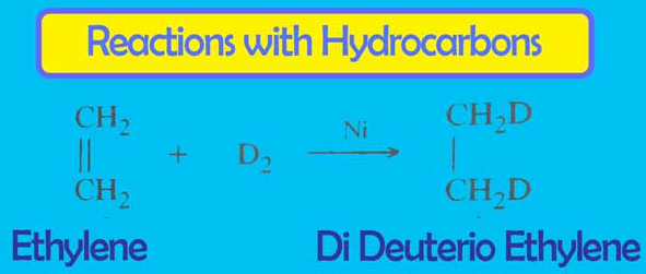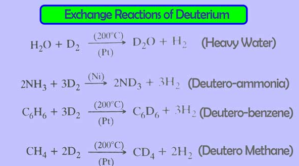 同位素的化學(xué)性質(zhì)相似。 因此,氘和氫也具有相似的性質(zhì)。 氘和氫的化學(xué)反應(yīng)速度不同。 氫的化學(xué)反應(yīng)大約是氘化學(xué)反應(yīng)的兩倍。 以下是它的一些關(guān)鍵化學(xué)反應(yīng)。