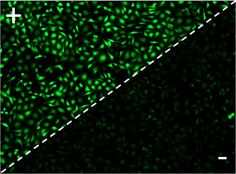 圖-1.HeLa cells loaded with Fluo-4 in the presence (+) or the absence (-) of 500 nM of the Ca²? ionophore ionomycin.