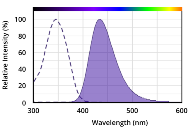 圖 1. 常用香豆素衍生物 AMCA 的激發(fā)和發(fā)射光譜。