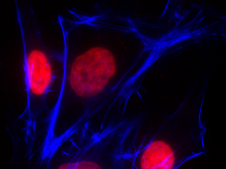 圖 2. HeLa 細(xì)胞在 4% 甲醛中固定,然后用 Phalloidin iFluor™ 350 偶聯(lián)物和 Nuclear Orange™ DCS1 染色。