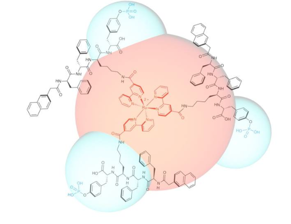 該團隊設(shè)計并合成了一種能夠識別宮頸癌細胞并在物理上阻止它們遷移的發(fā)光分子。該分子由一個釕金屬絡(luò)合物核心和三個以三維結(jié)構(gòu)連接的自組裝肽結(jié)構(gòu)單元組成。