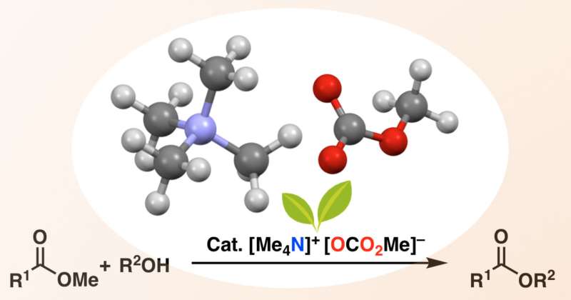 名古屋大學(xué)的一個團(tuán)隊(duì)開發(fā)了一種催化劑,可以顯著擴(kuò)大酯交換反應(yīng)的底物范圍。為了避免螯合,研究人員使用了一種無金屬催化劑,即碳酸四甲基銨 (TMC)。在合適的條件下,TMC 與醇原位反應(yīng)形成醇鹽離子,然后攻擊起始酯,以高收率生成復(fù)合目標(biāo)酯。