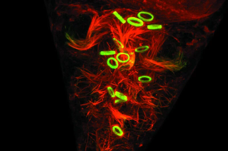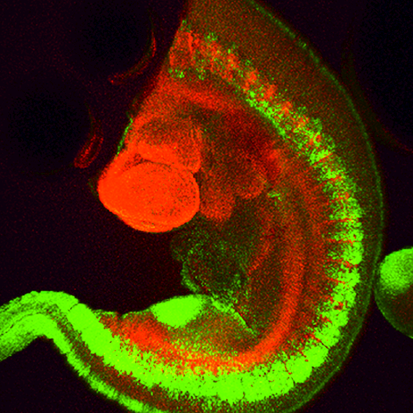 2. 小鼠轉基因胚胎,中間體,E10.5小鼠轉基因胚胎的五個中間體:EpaxisMyf5 eGFP; 對 GFP-Alexa 488 進行免疫染色; 胚胎肌纖維用 Desmin-Cy3 染色,細胞核從上到下顯示為 Hoechst 尺寸:3.5 mm (a), 800 µm (b)。 禮貌:Aurélie Jory, Cellules Souches et Développement, Institut Pasteur, Paris, France 和 IGBMC, IGBMC 影像中心