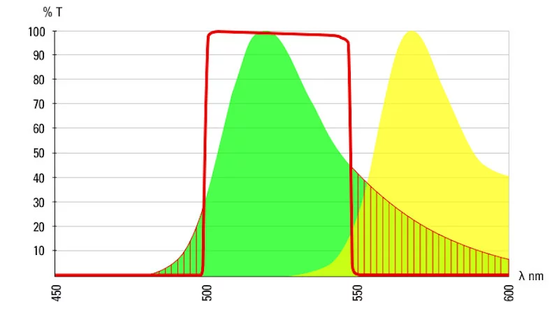 6.Alexa 488(綠色曲線)和Alexa 555(黃色曲線)的熒光發(fā)射曲線。 兩個發(fā)射光譜的重疊是顯而易見的。 紅線表示 488 發(fā)射濾波器的帶通。