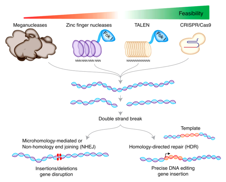 基因組編輯更快、更便宜、更高效。 基因組編輯允許研究科學(xué)家模擬 DNA 修復(fù)的自然過(guò)程。 使用最廣泛的基因組編輯工具是 CRISPR/Cas9,它是了解基因功能的有力工具。 CRISPR/Cas9 代表成簇的規(guī)則間隔的短回文重復(fù)。 除此之外,其他基因組編輯工具包括鋅指核酸酶 (ZFN)、轉(zhuǎn)錄激活因子樣效應(yīng)核酸酶 (TALEN) 和大范圍核酸酶。 這些技術(shù)是基因組編輯的先進(jìn)方法。