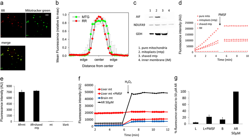 PMSF-sensitive conversion of AR to resorufin occurs in the mitochondrial matrix. (a) Confocal images of isolated liver mitochondria (average intensity projections of 10 Â 0.1 μM confocal planes captured at 1 Airy unit) showing resorufin and Mitotracker Green fluorescence. Resorufin fluorescence can be seen throughout the mitochondria matrix. Scale bar is 5 mM. (b) Mean line profile intensities of resorufin (RR) fluorescence through the central plane image of intact mitochondria after normalising both intensity (maxima ¼1) and size (edges and centre defined to set all objects to an equal, arbitrary diameter). N ¼ 13. Full width half maximum of the resorufin distribution is smaller than that of Mitotracker Green (MTG, p o 0.001, paired t test). (c) Western blots of mitochondrial subfraction marker proteins. AIF, apoptosis inducing factor; NDUFA9, NADH dehydrogenase 1 alpha subcomplex 9 (a component of complex I in the inner membrane); GDH, glutamate dehydrogenase. (d) Representative traces of resorufin fluorescence following incubation of the indicated liver mitochondrial subfraction with AR in the absence of HRP or substrate. All reactions are PMSF sensitive. (e) Resorufin fluorescence measured after incubation of intact liver mitochondria with AR for 10 min. Fluorescence (no PMSF, no further AR) was measured from intact mitochondria (ARþ mt) and after removing the outer membrane and intermembrane space (ARþ shaved mtp). Controls were mitochondria incubated without AR (mt) and blanks. Data are mean 7 SD, n¼ 3. (f) Representative traces of resorufin fluorescence in assay medium containing AR-pre-incubated liver (red circle) or brain (blue circle) mitochondria as only source of AR. Liver mitochondria were pre-treated (red diamonds) or not (red circle) with PMSF. 50mM AR without mitochondria was used as positive control. 49 pmole H 2 O 2 were added at the indicated time point. (g) Quantification of the experiment in f. Data are mean7 SD, n¼ 4. All values are significantly above 0 (Po 0.05, t-test). (For interpretation of the references to colour in this figure legend, the reader is referred to the web version of this article.)