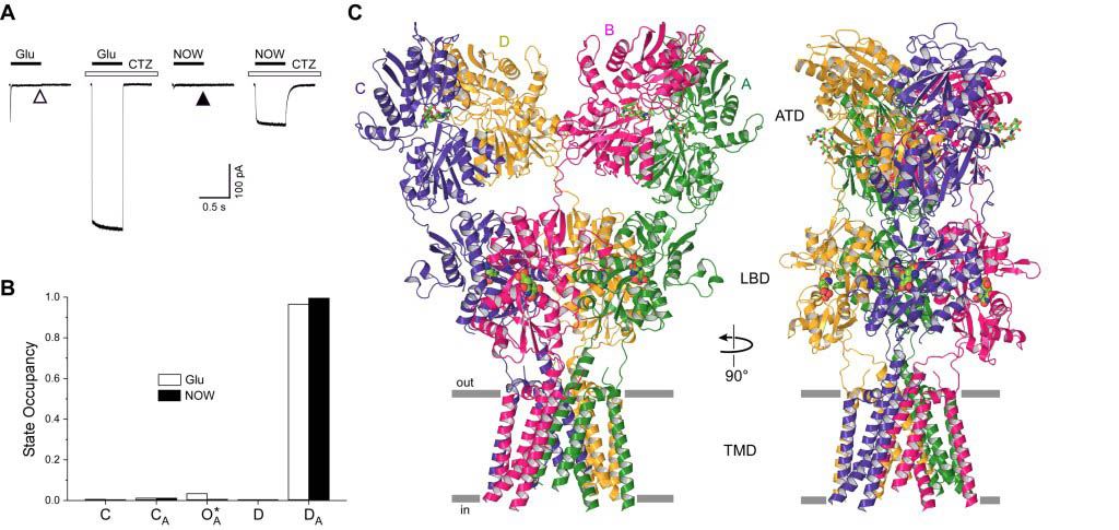 Ionotropic glutamate receptors (iGluRs) mediate most excitatory neurotransmission in the central nervous system and function by opening their ion channel in response to binding of agonist glutamate. Here, we report a structure of a homotetrameric rat GluA2 receptor in complex with partial agonist (S)-5-nitrowillardiine. Comparison of this structure with the closed-state structure in complex with competitive antagonist ZK 200775 suggests conformational changes that occur during iGluR gating. Guided by the structures, we engineered disulfide cross-links to probe domain interactions that are important for iGluR gating events. The combination of structural information, kinetic modeling, and biochemical and electrophysiological experiments provides insight into the mechanism of iGluR gating.