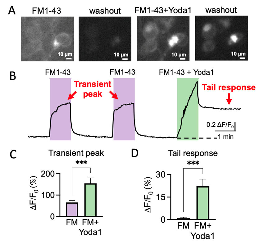 FM1-43 remains trapped after application of the Piezo1 agonist Yoda1 in Piezo1-transfected HEK cells. (A). Fluorescence snapshots of Piezo1-transfected HEK cells after 1 min application of 2 μM of FM1-43 (1st frame), during washout following only FM1-43 application (second frame). The third frame is captured at the top of 2 μM of FM1-43 + 25 μM of Yoda1 treatment (transient peak), followed by washout (fourth frame), where the dye remained trapped (tail response). Calibration bar-10 μm. (B). Sample trace of fluorescence intensity variations induced by double application of 2 μM of FM1-43 and following 2 μM of FM1-43 + 25 μM of Yoda1 for Piezo1-transfected HEK cells. Important elements in order to understand the outcome of the experiment are the transient peak, showing a treatment-induced acute response, and the tail response, addressing the long-lasting dye internalization. (C). Statistics of the percentage of increased fluorescence intensity of the transient peak increase in different cells when 2 μM of FM1-43 + 25 μM of Yoda1 are applied, compared to only 2 μM of FM1-43 (paired t-test, *** p < 0.001). (D). Statistics of the percentage of increased fluorescence intensity of the tail response (baseline) increase in different cells when 2 μM of FM1-43 + 25 μM of Yoda1 are applied, compared to only 2 μM of FM1-43 (paired t-test, *** p < 0.001).