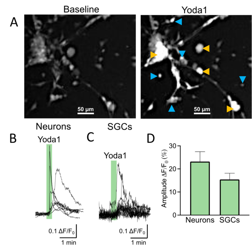 Live imaging shows that Piezo1 channels are functionally expressed on SGCs and neurons. (A). Fluorescent snapshots of 2DIV mouse trigeminal culture showing SGCs (blue arrows) and neurons (yellow arrows). The snapshots have been taken after 20 min of incubation with Fluo-4 AM. The left frame represents the trigeminal culture during baseline. The right frame shows cell activation after the application of 5 μM of Yoda1. Scale bar-50 μm. (B). Sample traces of calcium transients in trigeminal neurons induced by 5 μM of Yoda1 (n = 9). (C). Sample traces of calcium transients in trigeminal SGCs induced by 5 μM of Yoda1 (n = 12). (D). Statistics of the percentage of increased fluorescence intensity normalized to baseline in neurons (n = 9) vs. SGCs (n = 12) treated with 5 μM of Yoda1. There is no difference in Yoda1 responses among the different cell types (unpaired t-test, p = 0.120).
