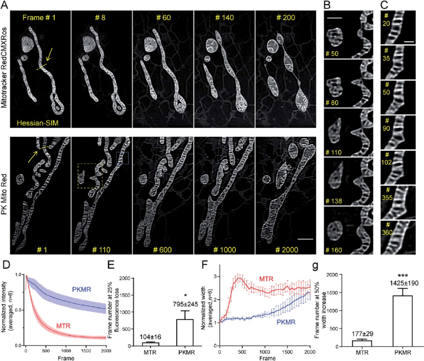 PK Mito Red enables ultra-long time-lapse recording of mitochondrial dynamics. (A) Time-lapse SR imaging of mitochondria in COS-7 cells using Hessian-SIM. Images were acquired 10 fps and processed using the "Enhance Contrast" command in ImageJ to compensate for fluorescence loss over time. (B) Close-up view of the yellow box in (A), highlighting mitochondrial tip-extension-retraction events. (C) Close-up view of the blue box in (A), highlighting dynamic protrusion events. (D) Normalized intensity profiles of time-lapse Hessian-SIM images (n ¼ 6). (E) Averaged frame numbers at 25% fluorescence loss. (F) Normalized internal width profile of mitochondria in time-lapse Hessian-SIM images (n ¼ 6). (G) Averaged frame numbers at 50% width increase of MTR and PKMR labeled mitochondria. Scale bars: (A) 2 mm, (B) 1 mm, (C) 500 nm.