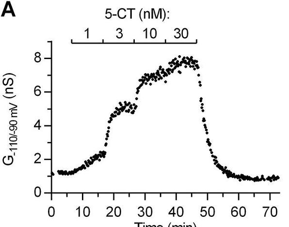 (A) 代表性實驗 (n = 6) 的時間過程顯示了增加浴液濃度的影響,應(yīng)用 5-HT1A 受體激動劑、5-CT 對背側(cè)向內(nèi)整流 K+ 電導(dǎo) (G-110/-90 mV) 的影響 raphe 5-HT 神經(jīng)元。細(xì)胞外溶液含有 5.5 mM K+ 和混合突觸阻滯劑。 在該圖中,時間表示全細(xì)胞配置的持續(xù)時間。
