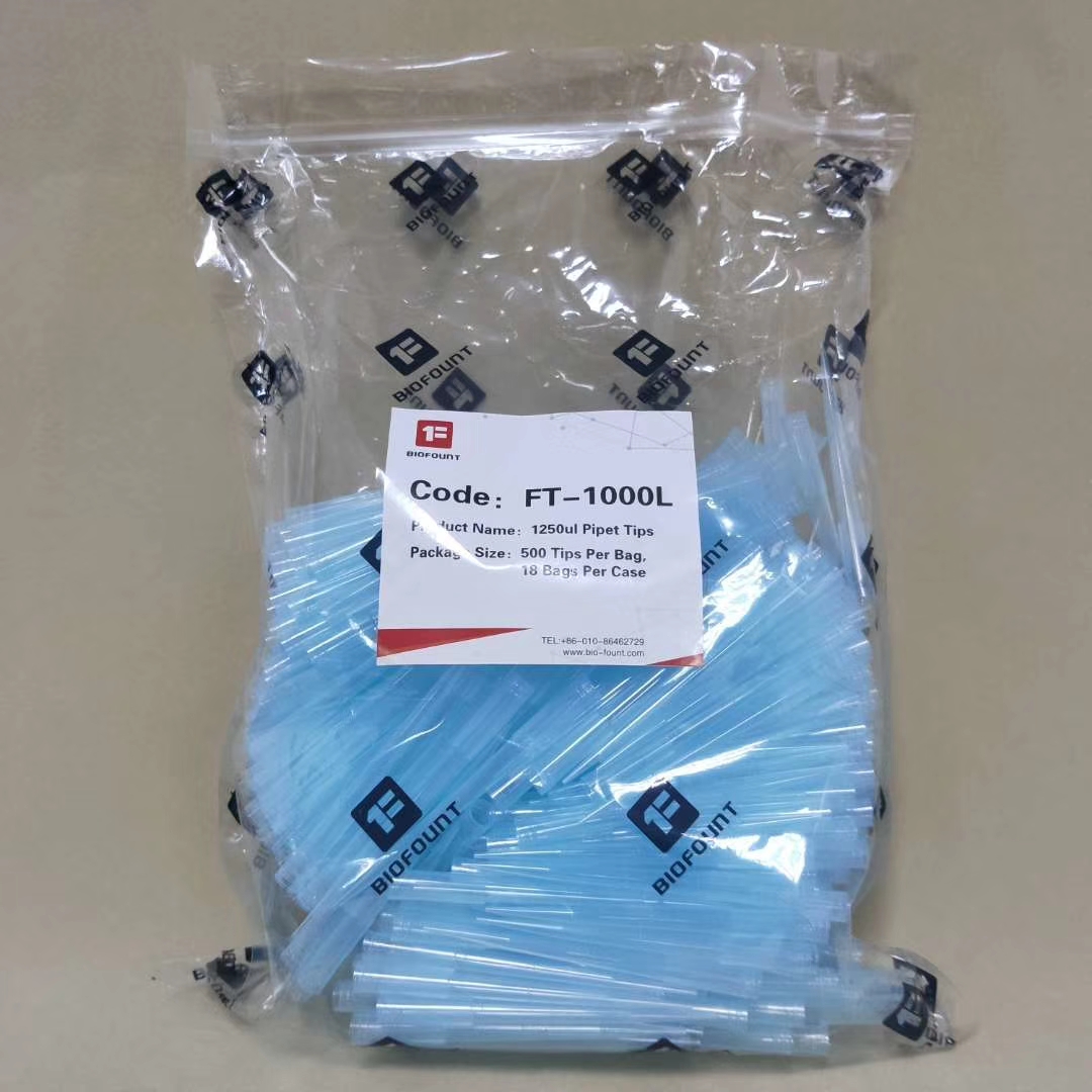 1250ul extended blue tip, material: polypropylene material PP material; features: good adaptability: suitable for commonly used pipettes on the market; high-quality raw materials: imported PP material, in line with USP Class-VI standards; precise aperture: Ensure smooth sample absorption; advanced manufacturing technology: molds with ultra-fine grinding molding technology, without mold release agent demoulding, can ensure better product quality; advanced design: to ensure good flexibility, sealing and compatibility of products; ·Good transparency: good transparency, easy to observe the liquid level during use; organic solvent resistance: can be used for the absorption of various organic solvents; ·Independent label traceability: each package has an independent article number label, which is convenient for quality tracking and traceability; Complete specifications: 10uL, 20uL, 200uL, 1000uL, 1250ul, 5ml, 10ml; bags and boxes.