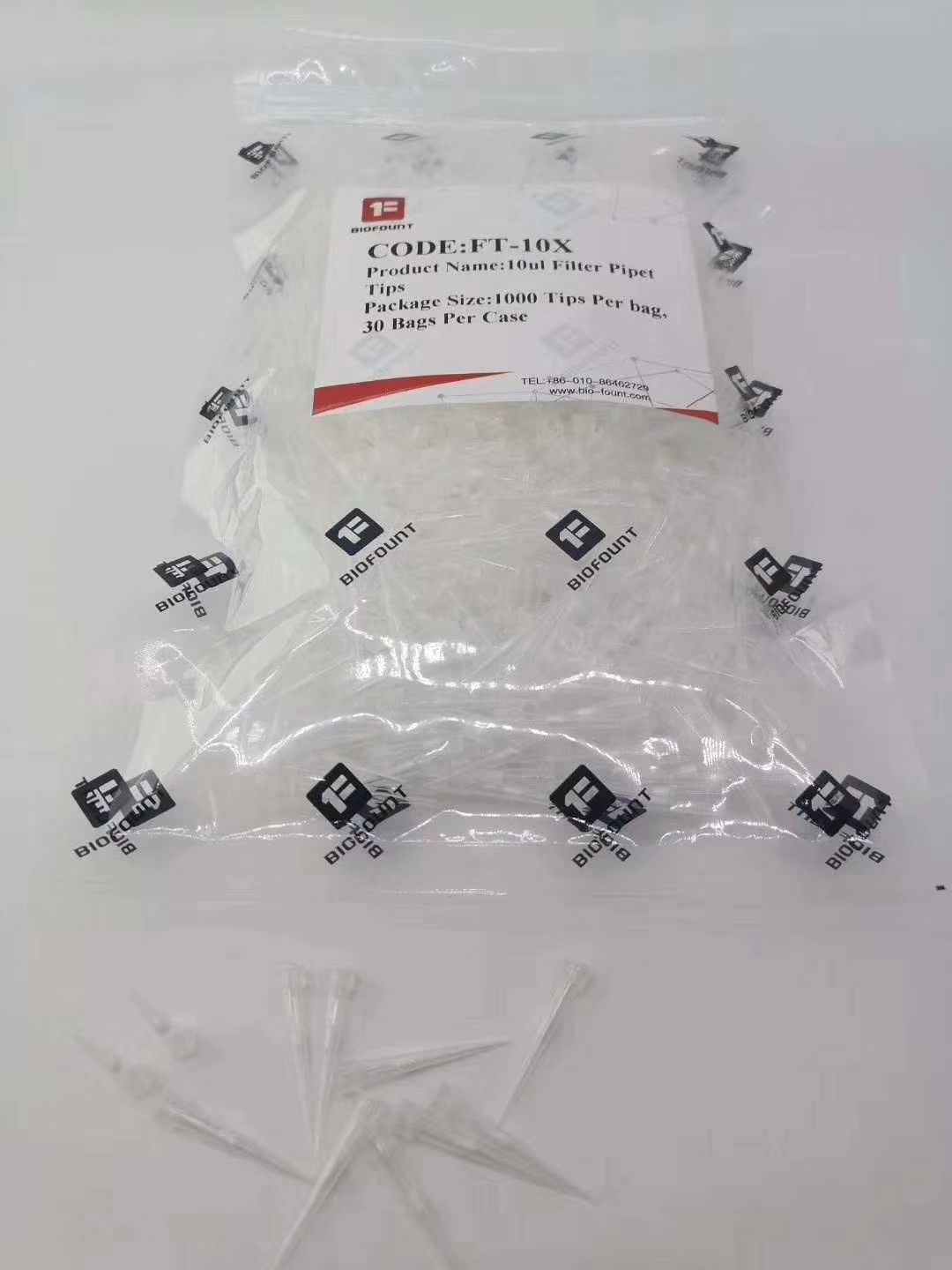Sterile enzyme-free 10ul filter pipet tip (10ul Filter Pipet Tip DNA Free RNA Free) (BI-10-X) is made of polypropylene PP; features: good adaptability: suitable for commonly used pipettes on the market; high-quality Raw material: imported PP material, in line with USP Class-VI standards; precise aperture: to ensure smooth sample absorption; advanced manufacturing technology: ultra-fine grinding and molding technology molds, no mold release agent is required to release the mold, which can ensure better product quality; Advanced design: to ensure good flexibility, tightness and compatibility of the product; · Good transparency: good transparency, easy to observe the liquid level when used; resistance to organic solvents: can be used for the absorption of various organic solvents; · independent identification traceability : Each package has an independent item number identification, which is convenient for quality tracking and traceability; complete specifications: 10l, 20ul, 200ul, 1000ul, 1250ul bag, box. The sterilized tip does not contain detectable bacteria, proteases, and trace metals. The hydrophobic surface provides minimal retention and maximum dispersion.