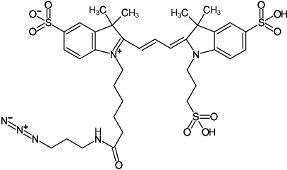 | Inchi | InChI=1S/C35H46N6O10S3/c1-34(2)27-23-25(53(46,47)48)14-16-29(27)40(20-7-5-6-13-33(42)37-18-9-19-38-39-36)31(34)11-8-12-32-35(3,4)28-24-26(54(49,50)51)15-17-30(28)41(32)21-10-22-52(43,44)45/h8,11-12,14-17,23-24H,5-7,9-10,13,18-22H2,1-4H3,(H3-,37,42,43,44,45,46,47,48,49,50,51) |