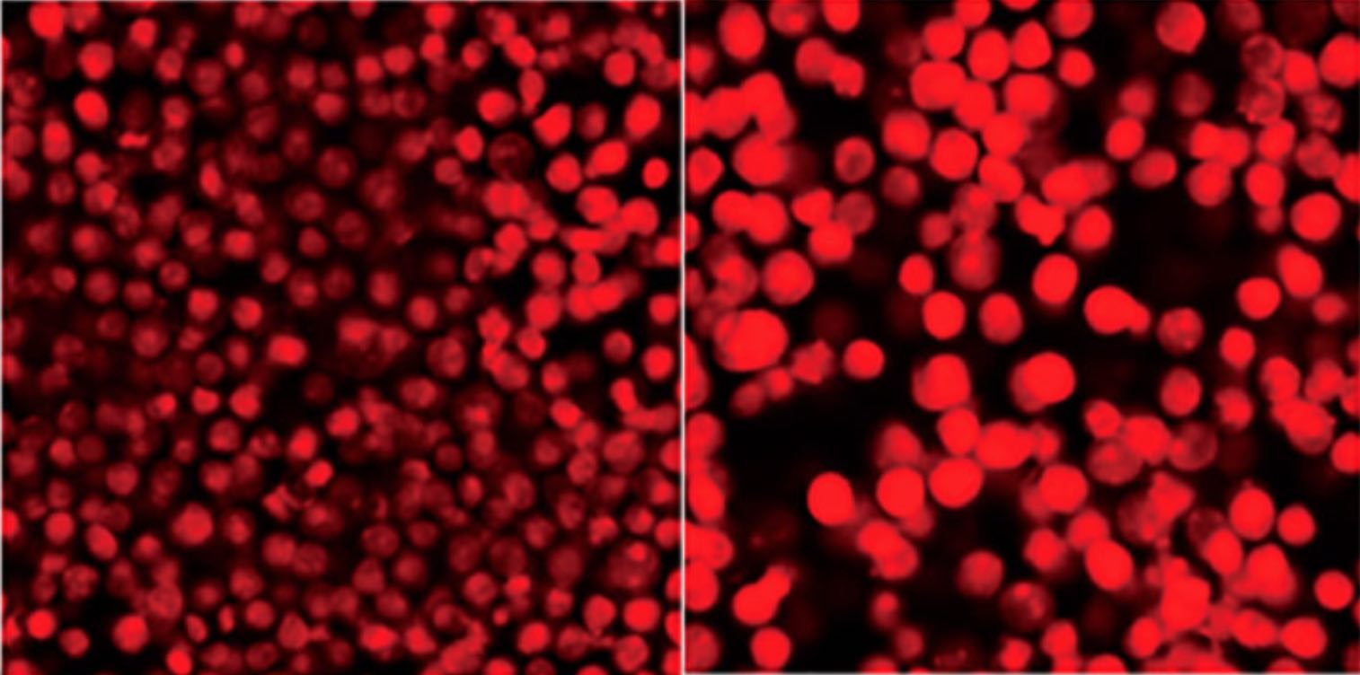 在顯微鏡檢查和高內(nèi)涵篩選中,DRAQ5™ 無需紫外激發(fā)即可輕松進(jìn)行核復(fù)染。 在流式細(xì)胞術(shù)中,DRAQ5™ 允許對血液/BM 進(jìn)行表型分析并直接進(jìn)行細(xì)胞 DNA 含量分析,而無需任何 RBC 裂解或固定、透化或 RNase 處理。