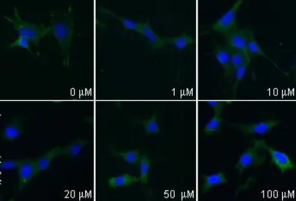 將細胞在含有不同濃度 ((+/-)-blebbistatin) 的 DMSO 培養(yǎng)基中于 37°C 孵育 1 小時,在室溫下用 4% 甲醛固定 10 分鐘,然后用含有 10% 山羊血清、0.3 M 甘氨酸、1% BSA 和 0.1% 吐溫在室溫下放置 2 小時。 在含有 1% BSA 和 0.1% 吐溫的 PBS 中,在 4°C 下用 ab32084(1/100 稀釋)對處理過的細胞進行染色。 將 1/250 稀釋度的 DyLight 488 山羊抗兔多克隆抗體用作二抗。 細胞核用 DAPI 復染并以藍色顯示。